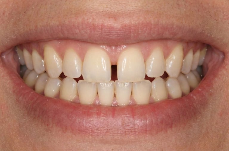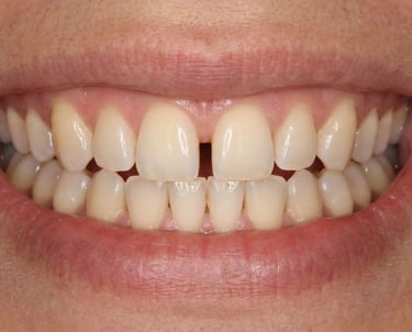 This image shows a patient with common dental issues that aligners can fix, such as a gap between the front teeth and crowding in the lower teeth. This is the starting point of the journey.