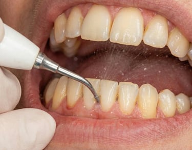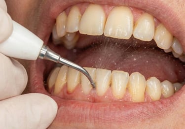 A dentist uses an ultrasonic scaler to carefully remove tartar from the lower front teeth.