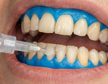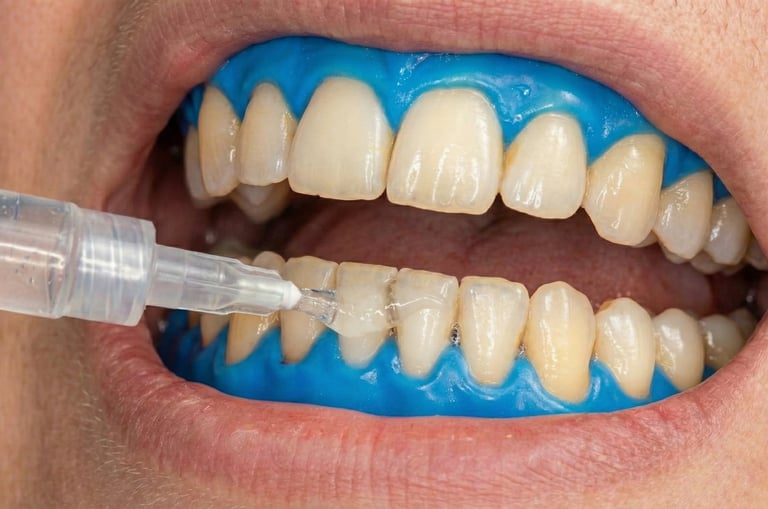 A professional whitening gel is applied to the teeth, while a blue barrier protects the gums.