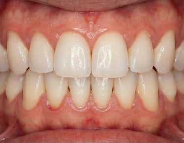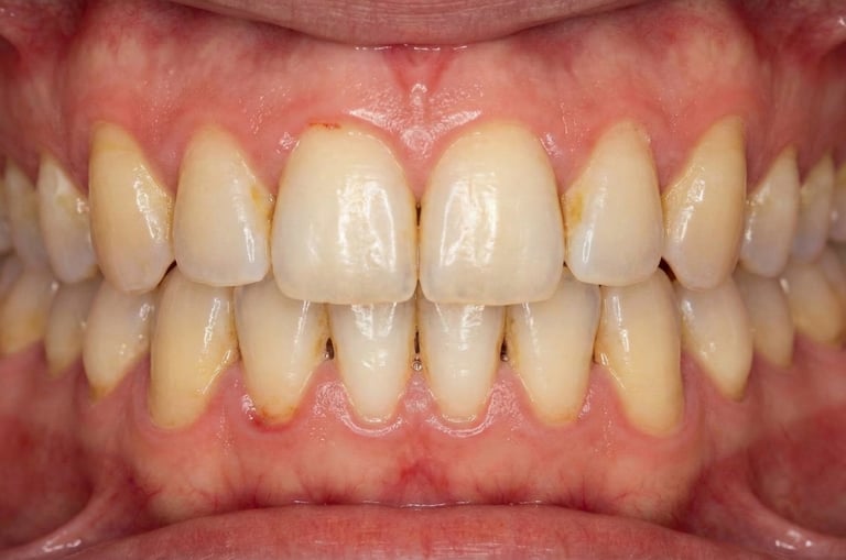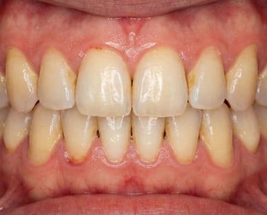 Before any procedure, Dr. Prasanna will examine your teeth and gums to assess their health. This image shows a typical case before cleaning, with visible tartar buildup along the gumline and general staining that cannot be removed by brushing alone.