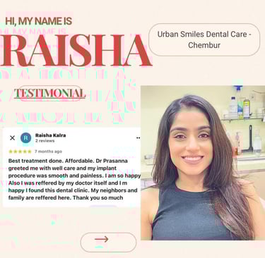 "I lost a molar and was having trouble eating. I visited Urban Smiles for a Dental Implant. Dr. Prasanna explained the whole process clearly. The implant feels exactly like my natural tooth now. If you are looking for an Implantologist in Chembur, this is the place to go." — Sneha P., Ghatkopar